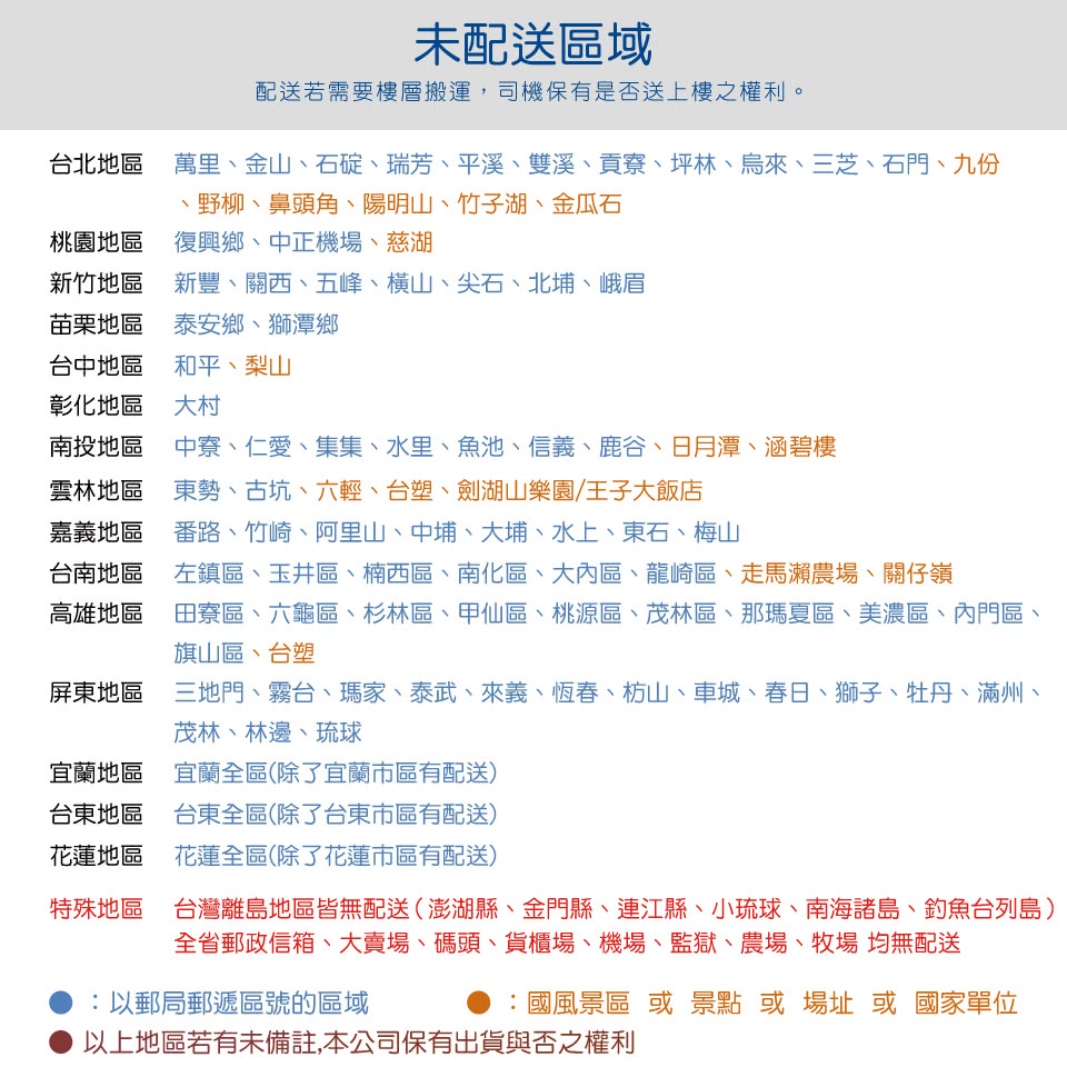 1.限台灣本島(偏遠山區恕無法配送,如欲知詳細區域,請來電客服詢問,不便之處,敬請見諒!)